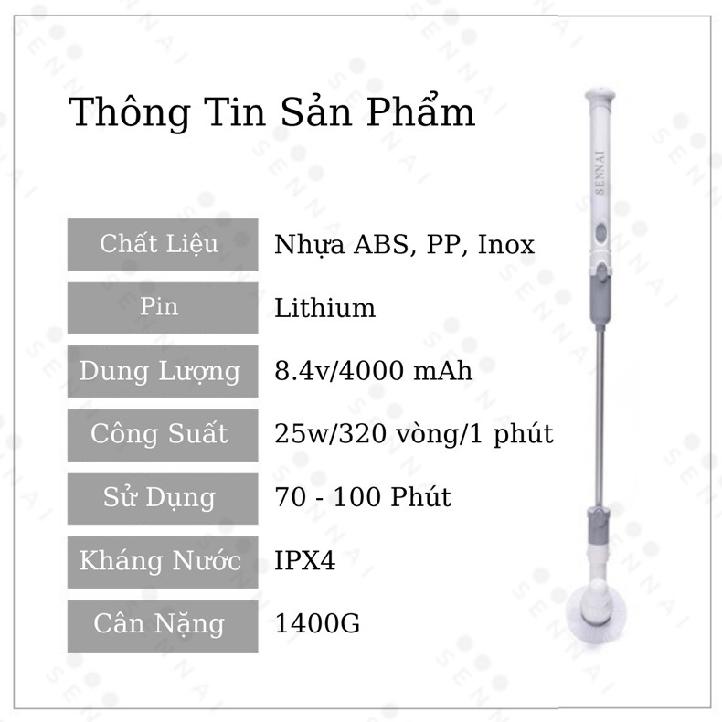 Chổi Cọ Nhà Vệ Sinh Bồn Cầu Toilet Không Dây Đa Năng SENNAI Công Suất 25W Pin 4000mAh - Hàng Chính Hãng - MẪU MỚI NHẤT VỪA RA MẮT CHỔI CỌ NHÀ VỆ SINH BỒN CẦU TOILET KHÔNG DÂY ĐA NĂNG SENNAI, tích hợp nhiều hiệu suất cao trong 1 sản phẩm, thiết kế mới mẻ, hiệu suất đầy đủ sẽ giúp chị em tiết kiệm được vô số thời gian cũng như công sức của con người trong việc quét dọn và sắp xếp hằng ngày. Nhất là đối với chị em đang mang thai, những cô nàng có tiền sử đau sống lưng, mỏi gối, da tay hay bị bong tróc do tiếp xúc với chất tẩy rửa thường xuyên hay đơn giản là không thích tiếp xúc với vết bẩn thì chắc chắn là không thể bỏ qua sản phẩm này. CHỔI CỌ NHÀ VỆ SINH BỒN CẦU TOILET KHÔNG DÂY ĐA NĂNG SENNAI sử dụng công nghệ tiên tiến pin Lithium thân thiện với môi trường tự nhiên thiên nhiên, dung tích cức lớn lên đến mức 4000mAh giúp bạn thỏa sức dọn nhà chỉ với 1 lần xạc. Thời gian sử dụng của Cây Chà Điện Vệ Sinh Làm Sạch Nhà Cửa Đa Năng SENNAI lên đến mức 100 phút (không tải), 65 - 70 phút khi sử dụng liên tục thoải mái đáp ứng mọi nhu yếu hằng ngày. Chuẩn kháng nước IPX4/IPX6 phối hợp động cơ điện không chổi than giúp máy không biến thành nóng lên trong quá trình sử dụng cũng như kéo dãn tuổi thọ của sản phẩm lên tới 5 năm. Tốc độ quay 320 vòng/1 phút, hiệu suất 25w sẽ đáp ứng đủ nhu yếu quét dọn và sắp xếp hằng ngày, với tốc độ quay ổn định, nước sẽ không biến thành văng lên mọi khi cọ rửa, hạn chế vết bẩn bắn lên trên người. Lực nén môtơ cực lớn 10,5kg (tương đương việc bạn sử dụng ngón tay trỏ đè thẳng vào cân đồng hồ và kim hiển thị mức 14,5kg - cân 100kg) thì máy sẽ tự động ngắt để bảo vệ động cơ chống quá tải. Cấu tạo hợp lý giúp người tiêu dùng để dàng thao tác, tốc độ xoay cùng như lực nén môtơ vừa đủ giúp nước không biến thành văng tung tóe lên trên người tiêu dùng. ✍THÔNG TIN SẢN PHẨM : ✅Thương hiệu: SENNAI ✅Dung lượng pin: 4000mAh, sử dụng công nghệ tiên tiến pin Lithium bảo vệ môi trường tự nhiên thiên nhiên phối hợp công nghệ tiên tiến sạc nhanh 2 tiếng giúp tối đa thời gian sạc, tiết kiệm thời gian ✅Chuẩn kháng nước: IPX4 cho thân máy, IPX6 cho cụm đầu máy 25w ✅Động cơ: Motor lõi đồng, không chổi than phối hợp cùng cụm bánh răng hành tinh, bánh ranh tụt giảm ✅Tốc độ quay: 320 vòng/1 phút ✅Màu sắc: Trắng - Bạc ✅Chất liệu: Vỏ nhựa ABS, bộ đầu cọ nhựa PP (04 cọ kèm máy) ✅Kiểu dáng: Thân thẳng hoàn toàn có thể điều chỉnh dài ngắn, máy 14w hoàn toàn có thể gập 3 hướng vì kết cấu máy nhỏ hiệu suất thấp, máy 25w sử dụng động cơ lớn nên có hiệu suất to hơn, máy to hơn nên phần đầu máy được thiết kế mở góc cố định và thắt chặt 120 độ, giúp đảm bảo ổn định trong quá trình sử dụng, tránh hiện tượng kỳ lạ rung lắc gây ảnh hưởng đến thiết bị cũng như trải nghiệm của người tiêu dùng, tăng tuổi thọ của sản phẩm. ✅Xuất xứ: Lắp ráp và hoàn thiện tại Việt Nam ✍Chi tiết & Công dụng : ☑ Sử dụng để chà rửa nền Tolet, cọ bồn rửa, bồn tắm, toilet, CÓ ĐẦU CỌ TOILET RIÊNG BIỆT, KHÔNG BỊ GHÊ TAY... ☑ Chà rửa những vết bẩn cứng đầu trong phòng nhà bếp, nhà bếp gas, góc tường,... ☑ Vệ sinh đồ dụng có khe hở nhỏ như máy lạnh, máy hút mùi, khe cửa,... ☑ Vệ sinh chà rửa lavabo rửa chén, vòi nước lavabo,... ☑ Có thể sử dụng để chà những vết bận trên tường, sàn, lốp xe, nền sân gạch, sân xi măng,... ☑ Tùy chính độ dài nhờ cây nối thẳng, nhà sản xuất khuyến nghị chỉ sử dụng cây nối dài khi thật sự thiết yếu, nếu không, bạn hãy bỏ qua cây nối dài để sản phẩm đạt hiệu suất cao nhất ☑ Đi kèm máy có 04 bộ đầu cọ sử dung cho những mục địch rất khác nhau theo hướng dẫn sử dụng ☑ Sử dụng nguồn điện sinh hoạt 220v để xạc đầy pin cho thiết bị ☑ Bảo quản nơi khô ráo thoáng mát ✍Bảo hành : Đổi trả miễn phí trong 7 ngày đầu, bảo hành 12 tháng theo chủ trương từ Nhà Sản Xuất. ➡ Ngày nay, việc dọn nhà chiếm rất nhiều thời gian và công sức của con người của chị em, nhất là đối với những mẹ bầu, việc quét dọn và sắp xếp, vệ sinh toilet như thể một trong cực hình. Hiểu được điều đó, SENNAI VIETNAM đã nghiên cứu và phân tích cho ra sản phẩm CHỔI CỌ NHÀ VỆ SINH BỒN CẦU TOILET KHÔNG DÂY ĐA NĂNG SENNAI tích hợp vô số hiệu suất cao trong 1 sản phẩm, chắc chắn là sẽ xử lý và xử lý được những vấn đề nếu trên, rút ngắn thời gian lau dọn, giảm thiểu sức lao động, tiết kiệm thời gian công sức của con người cho những chị em. ➡ Đến với SENNAI những bạn hoàn toàn có thể yên tâm rằng những sản phẩm CHỔI CỌ NHÀ VỆ SINH BỒN CẦU TOILET KHÔNG DÂY ĐA NĂNG của chúng tôi sẽ xử lý và xử lý được toàn bộ những vướng mắc của chị em lâu nay nay, sản phẩm chính hãng SENNAI VIETNAM đảm bảo chất lượng s