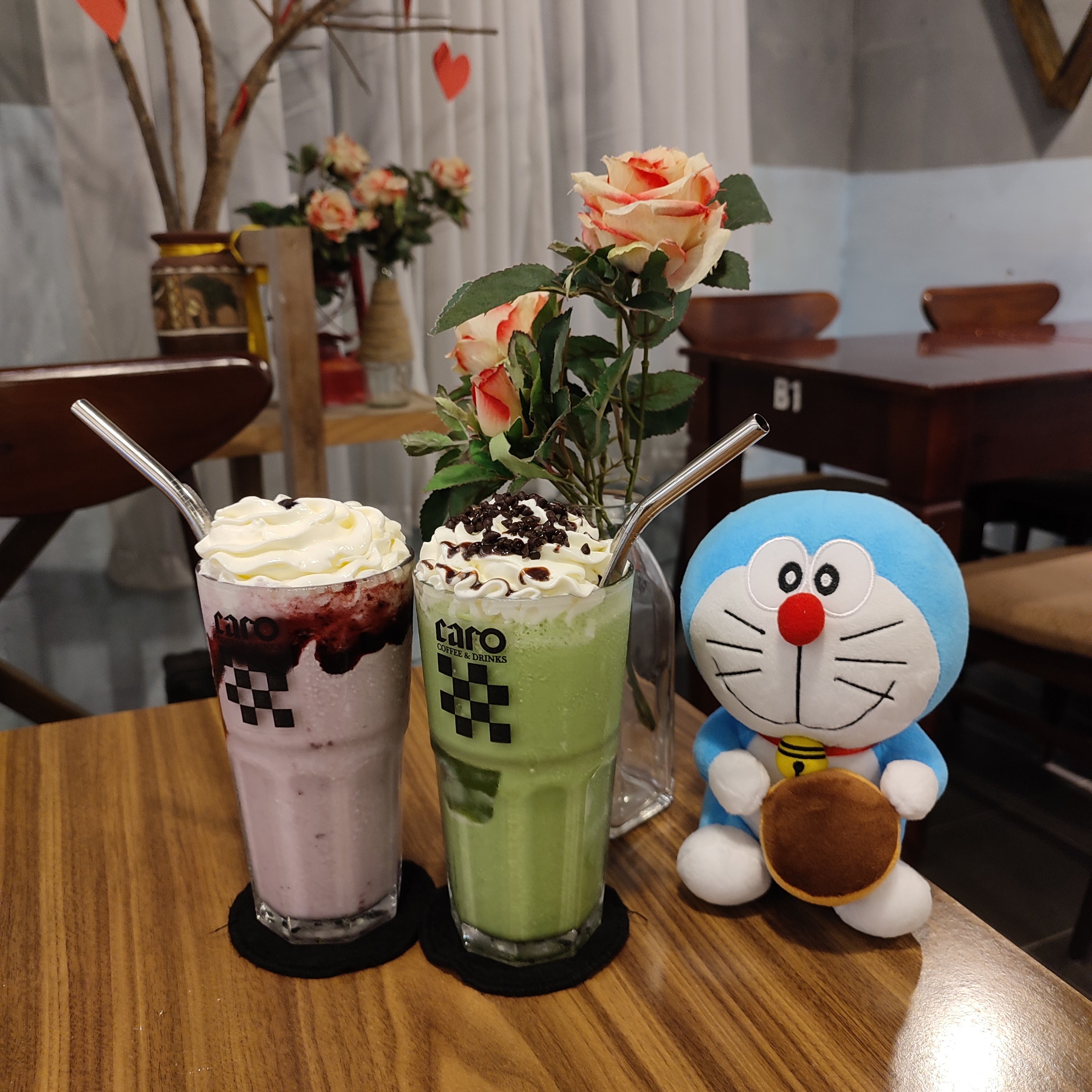Đồ uống được pha chế hơi lâu. Trà đào cam sả, Matcha đá xay hơi ngọt một chút ít. Cảnh quan ổn, nhiều góc chụp đẹp.