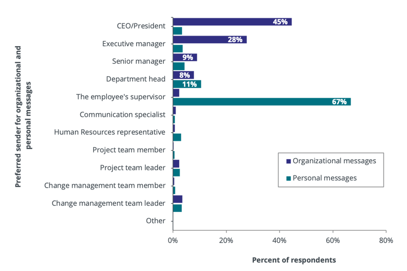 Effective communication during change starts with using preferred senders. Employees prefer to receive business-level messages about the change from leaders the top of the organization. When it comes to personal messages about the change, such as answers to "What's in it for me?" employees want their immediate supervisor to communicate with them.