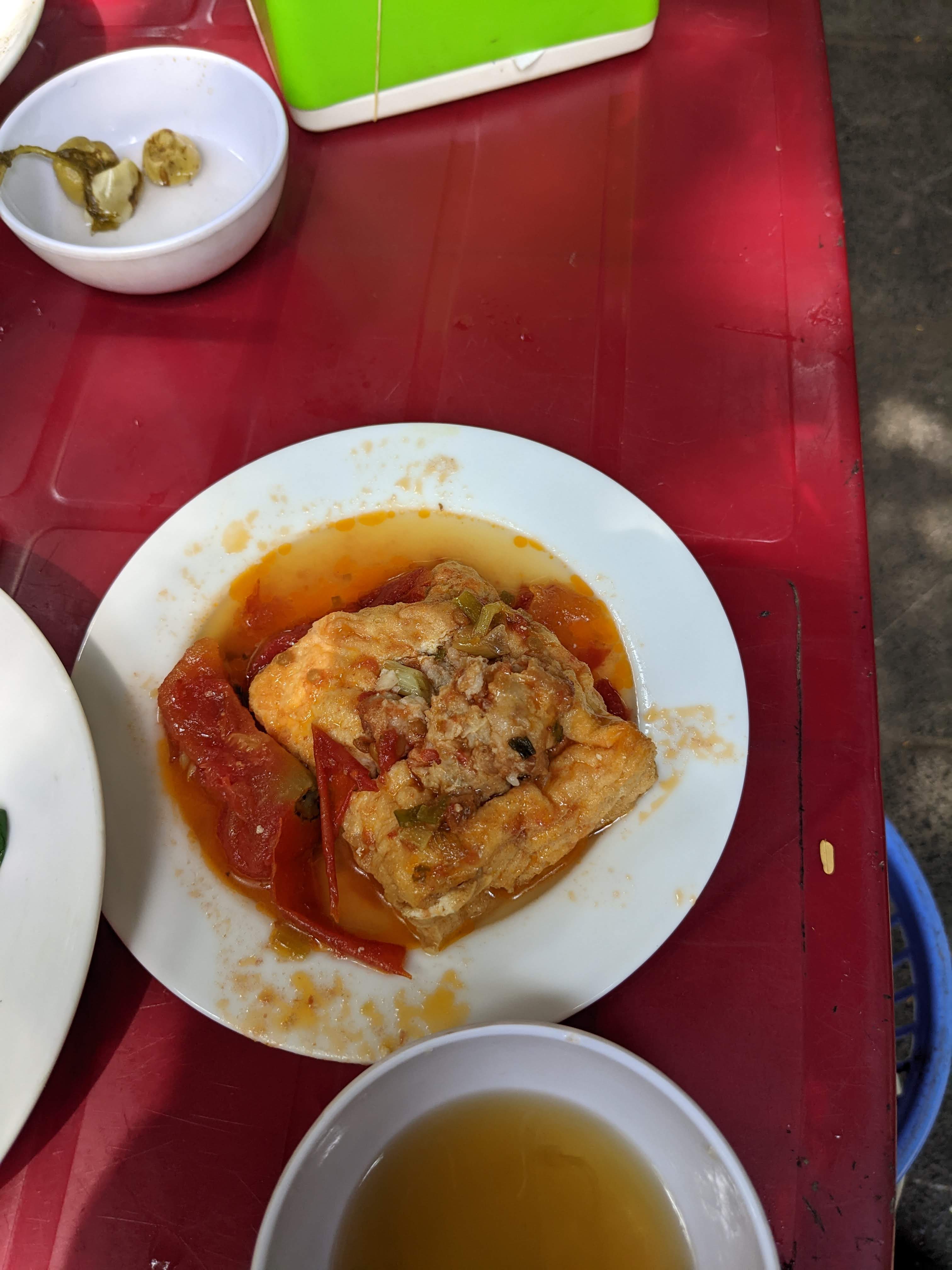 Cơm bụi vỉa hè giá đắt hơn nhà hàng quán ăn. 1 con cá diếc bằng 2 ngón tay, 1 miếng đậu phụ thịt, 3 miếng thịt kho, + cơm canh cà muối. Giá 150k. Đồ này ở quán khác chắc 40- 50k.